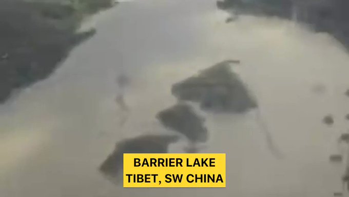 ধস নেমে এভাবেই আটকে যায় নদীর গতিপথ। ছবি: শিনহুয়া নিউজের টুইটার হ্যান্ডলের সৌজন্যে